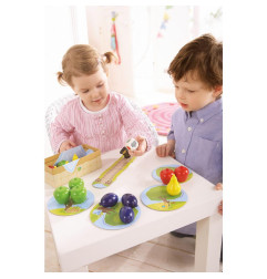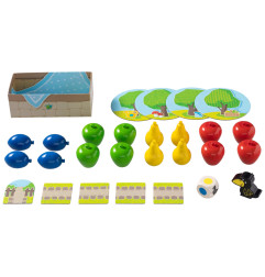 Contenu :Â 1 corbeau et 16 fruits en bois, 1 corbeille de fruits, 5 tuiles chemin, 4 arbres, 1 dé, 1 règle du jeu.