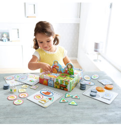 Contenu: 1 étal, 12 pièces en bois, 4 billets HABA, 16 plaquettes de produits, 4 listes de courses, 1 dé, 1 règle du jeu.