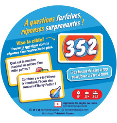 Zéro à 1000 est LE jeu de connaissances pour ceux qui n'en ont (toujours) pas ! Visez la cible et trouvez la question dont la réponse s'en rapproche le plus. Le principe est le même que Zéro à 100 avec des nouvelles cartes Questions encore plus farfelues et des réponses toujours plus surprenantes !