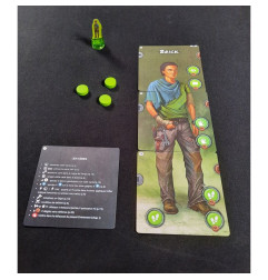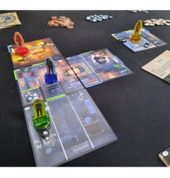 Un pion sablier parcourt cette ligne de temps pour activer les cartes ajoutées par vos actions et c'est le cœur du jeu : le scénario est écrit mais le jeu réagit à ce que vous faites pour déclencher une réaction en chaine d'évènements. L'idée est de se rapprocher d'une narration forte inspirée du cinéma ou des séries TV pour favoriser l'immersion.