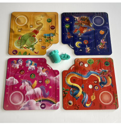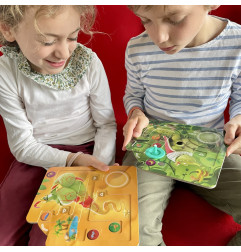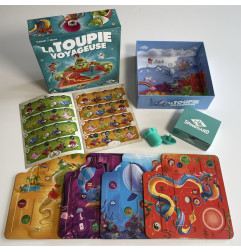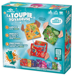 LA TOUPIE VOYAGEUSE est un jeu solo ou coopératif pour tout âge dès 6 ans. Chaque mission représente un parcours que les joueurs vont devoir effectuer avec une toupie en la passant d’un plateau à un autre. Ils représentent 8 mondes merveilleux en relief avec plusieurs cibles. Au début de chaque mission, les joueurs identifient ensemble les cibles à atteindre et se répartissent les plateaux indiqués. Le premier joueur lance la toupie avec l’aide du propulseur et la déplace en inclinant son plateau pour la diriger vers sa cible. Une fois la cible atteinte, le joueur guide la toupie vers la sortie pour la faire passer sur le plateau tenu par le joueur suivant. La dynamique de relais entre les joueurs se poursuit ainsi jusqu’à la réalisation complète de la mission. La difficulté des défis s’accroit progressivement. Des trophées autocollants permettent de valider chaque mission réussie !