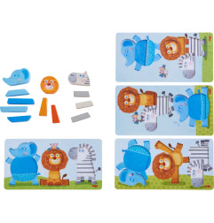 Ce jeu d’assemblage emmène les enfants pour un safari sens dessus-dessous. Qu’ils soient placés selon le modèle ou n’importe comment, l’éléphant, le zèbre et le lion amuseront les tout-petits. En assemblant les pièces, les petits artistes développeront leur créativité de manière ludique.