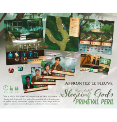 Primeval Peril se déroule sur une rivière dangereuse qui serpente à travers une jungle luxuriante. Il inclut de nouveaux personnages et de nouvelles histoires afin de ne rien gâcher du jeu de base Sleeping Gods. Cette édition issue d’un print & play imaginé par l’auteur a été revue et augmentée avec de nouvelles histoires et quêtes, un gameplay simplifié et un atlas avec de nouvelles cartes !