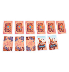 • 1. Vous avez trois kangourous sur le plateau et onze cartes devant vous (six cartes numérotées entre 2 à 7, deux cartes « Plonk! » et trois empreintes de pattes)