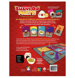 Sushi Go Party! est la version étendue du classique Sushi Go! Les règles ne changent pas, il faudra faire le maximum de points en choisissant les mets les plus succulents qui s'offrent à vous. Cependant, cette version vous permet de customiser chaque partie en sélectionnant différentes variétés de sushi, maki et autres edamame.