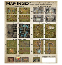 Ce pack comprend 24 cartes de 43cmx28cm dans un univers fantasy. Elles peuvent s'assembler entre elles pour créer de plus grandes maps. Vous y trouverez un peu de forêt, des ruines, un donjon, une taverne... Le nécessaire pour se lancer dans la vallée des périls !