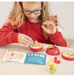 3 tranches de pomme (niveaux inférieur, intermédiaire et supérieur), 5 vers, 1 livret comportant 80 défis et leurs solutions