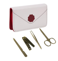 Contient la pochette manucure, un coupe-ongles, une paire de ciseaux, une pince à épiler et un coupe-cuticules.